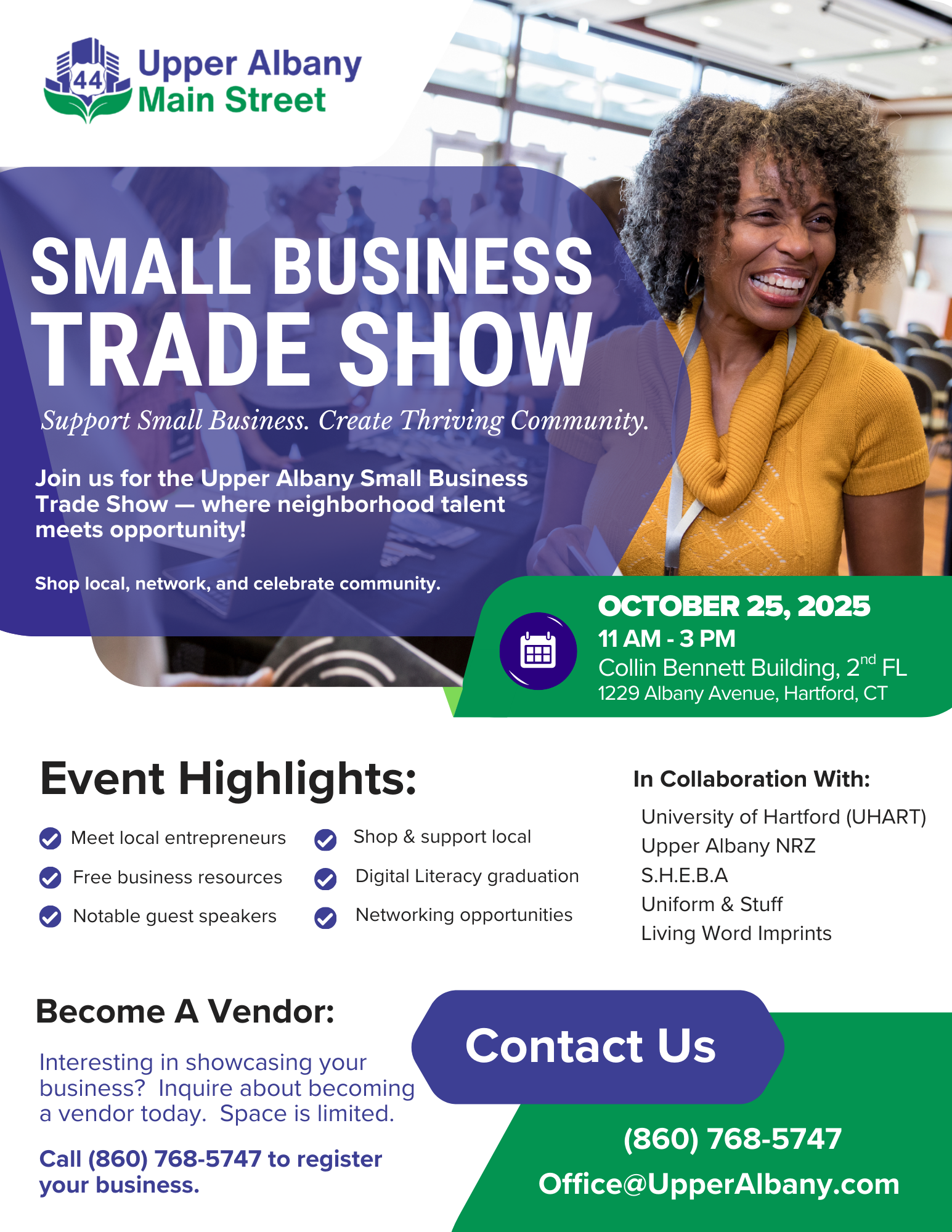 Be part of the excitement at the Upper Albany Main Street Small Business Trade Show on Saturday, October 25, 2025, at 11:00 AM! Meet and support local Hartford businesses, make valuable connections, and experience the best our community has to offer—all in one place.
